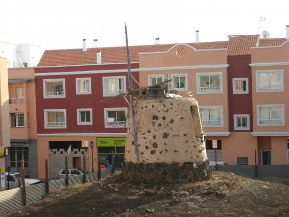 Molino de castilla o molino macho con planta circular, actualmente le quedan los palos que sustentaban las aspas, aunque se adivina que tuvo cuatro. La edificación carece de techo, está construida con mampostería de piedras, barro y cal, se observan restos de la maquinaria. Situado sobre una montaña de tierra, rodeado de diversos edificios y con una baya que cierra el paso al público.