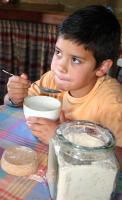 Plato de gofio escaldado y tocino. Tomando leche con gofio.