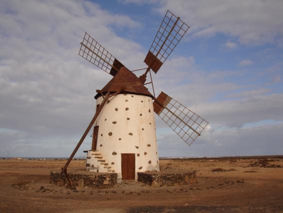 Molino macho con edificación de piedra, barro y cal, con planta circular y estructura trococónica, con techumbre cónica y cuatro aspas de madera. Dos pisos con escalera adosada a la pared exterior que comunica dos puertas. El molino se encuentra ubicado en una llanura en dirección al Cotillo, que se divisa fácilmente desde la carretera.
