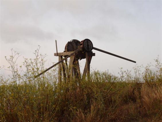 Molino de Ortega con planta rectangular, estructura sobre la cual se sustentan los restos de madera de la torre que sostiene las aspas. Se encuentra en mal estado de conservación.