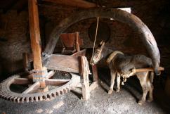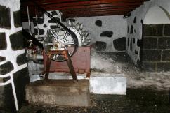 En las Islas Canarias existió un escaso número de tahonas. En el periodo de ausencia de vientos se potenciaba su uso. Las tahonas, también llamadas molinos de sangre, funcionan a través del movimiento que ejerce un animal (camello, yegua, burro o caballo) o la fuerza humana al empujar una viga de madera curvada, colocada horizontalmente a unos centímetros del suelo. Ésta se inserta en otra viga colocada verticalmente y que acaba en punta sobre el suelo, a modo de punzón. Unida al mecanismo de molturación de la tahona permite el movimiento de la piedra de moler, obteniéndose el preciado alimento. |